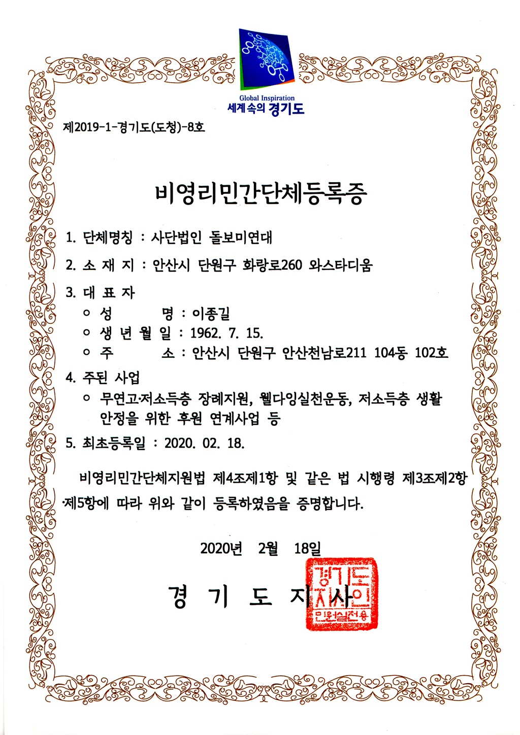 사단법인 돌보미연대, 경기도 민간단체등록증 페이지 정보 작성자 운영자 댓글 0건 조회 1,246회 작성일 20-02-11 15:29 본문 사단법인 돌보미연대, 경기도 민간단체등록증 SNS공유 목록 이전글한국장례지원센터 주식회사 면세법인 사업자등록증 20.02.11 다음글사단법인 돌보미연대 고유번호증 20.02.11 댓글목록 댓글목록 등록된 댓글이 없습니다.