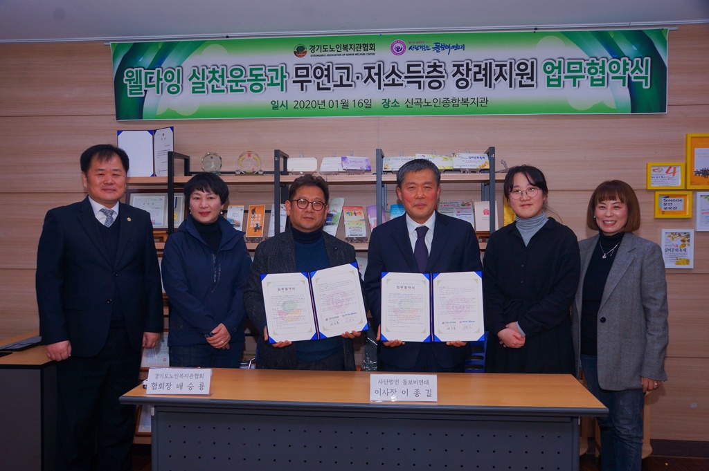 (사)돌보미연대(이사장 이종길)와 경기도노인복지관협회(회장 배승룡)가 의정부 소재 신곡노인복지관 누리 사무실에서 웰다잉 실천운동과 경기도내 노인복지관 무연고·저소득층 장례지원에 관한 업무협약을 16일 체결했다.